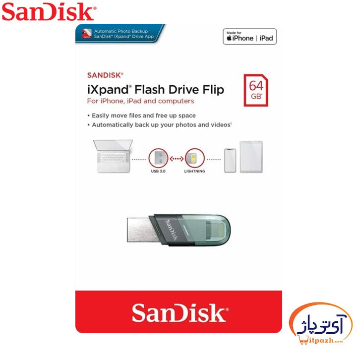 برای خرید فلش مموری Lightning سن دیسک 64 گیگابایت مدل Ixpand FLIP در مشهد میتوانید از وبسایت ای تی پاژ استفاده کنید.
